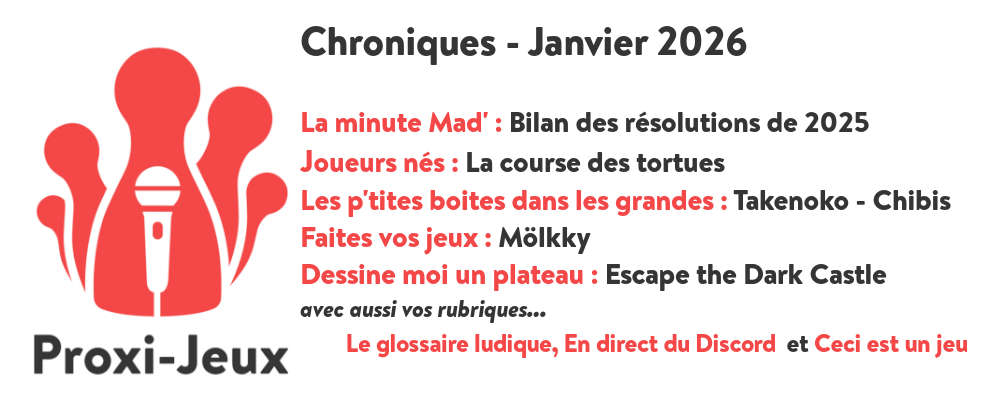 Janvier ! Forcément, soucieux de faire perdurer les traditions, Cargo et Mad' vont parler de galette des rois et ça tombe bien parce que Madinette en a mangé une le midi même ! Accessoirement, vous allez aussi entendre parler de jeux de société dans les premières Chroniques de l'année de Proxi-Jeux ! Lire la suite
