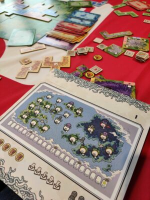 Drou découvre le dernier-né de Cosmoludo, qui sort un peu de la gamme à deux joueurs et boîtes graphiques. Kumata est un jeu à 4 de pose de dominos avec une petite thématique.