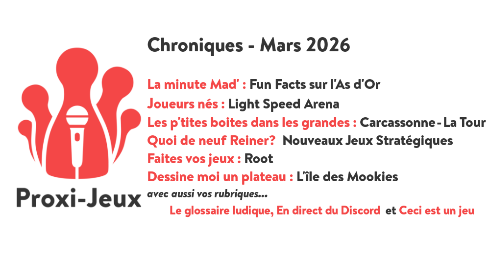 En mars, fais ce qu’il te plait ! Cargo et Mad’ vous partagent donc leurs poèmes, leurs blagues et leurs anecdotes entre les Chroniques préparées avec passion et application par les membres de l’équipe de Proxi-Jeux !