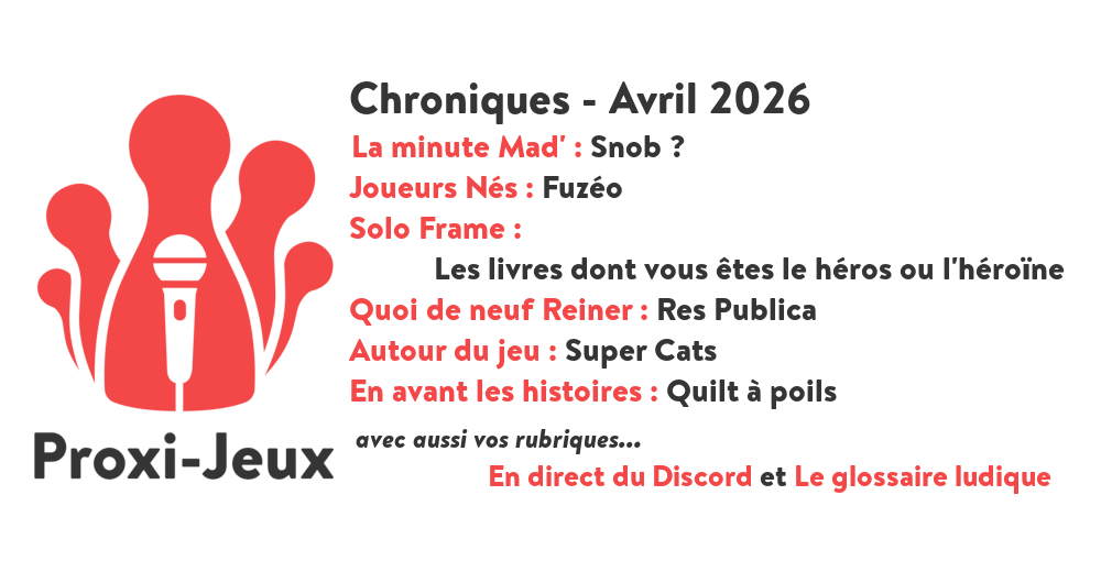 Pas un geste ! Vous êtes au bon endroit pour écouter les Chroniques d’avril présentées par les snobs Cargo et Mad’ et préparées avec soin par l’équipe de Proxi-Jeux. Au programme un voyage en fusée, des supers héros d’histoires, des chats et un docteur.