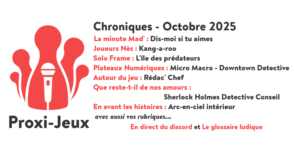 Octobre ! Le moment de régler vos pendules pour écouter les Chroniques de Proxi-Jeux en compagnie d'un Cargo (en forme) et d'une Mad' (en mousse). Lire la suite
